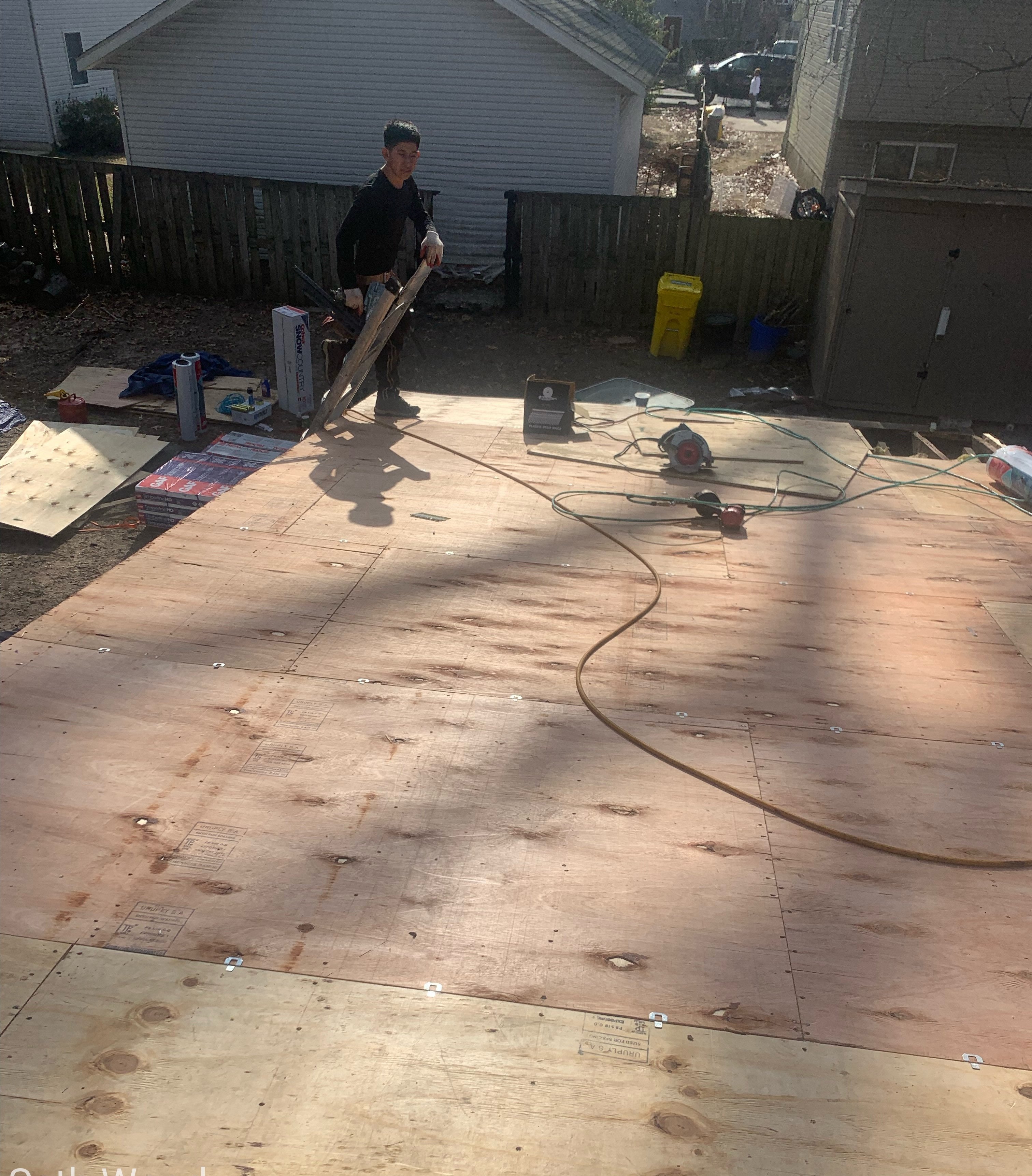 This older home in the 21122 area required a more extensive roofing solution due to widespread plywood failure and structural issues. The roof deck required full plywood replacement, along with sistering the joists to restore proper support.