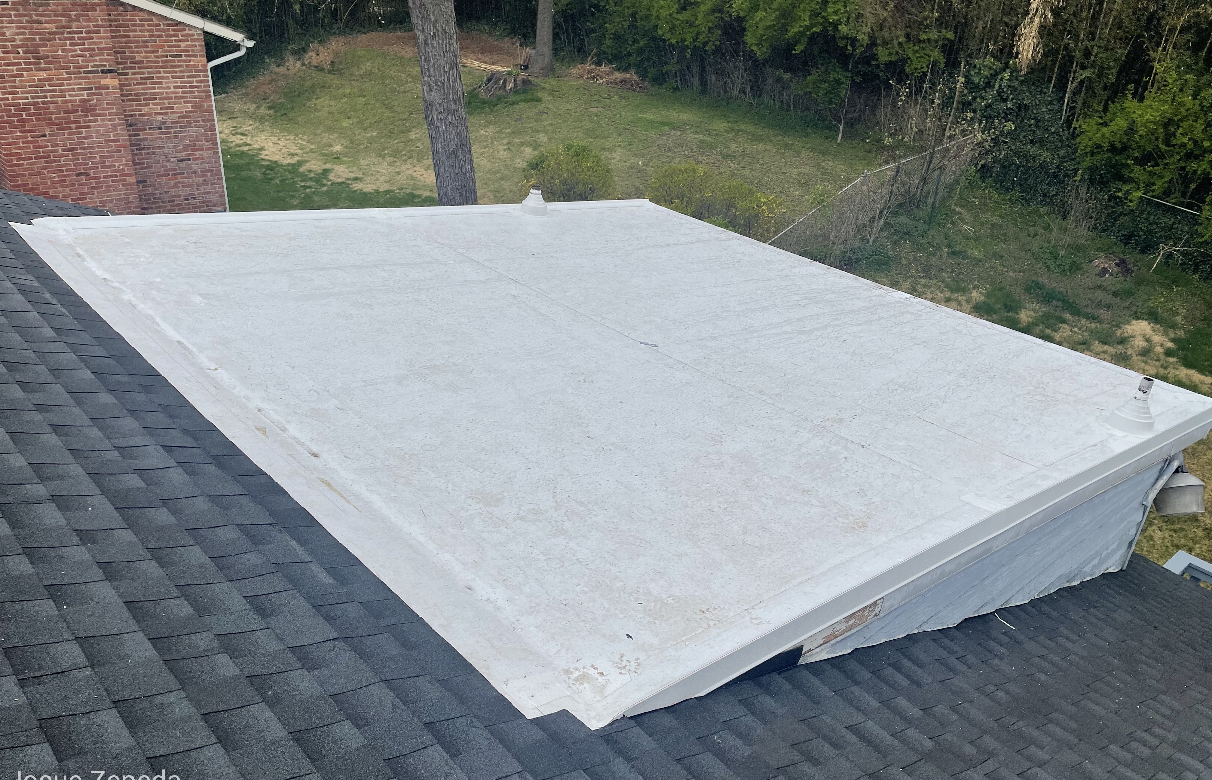 We removed the old materials and installed a new TPO membrane system, including proper transition flashing and tie-in details between the flat roof and shingle section. The updated system now provides a watertight connection and long-term protection.