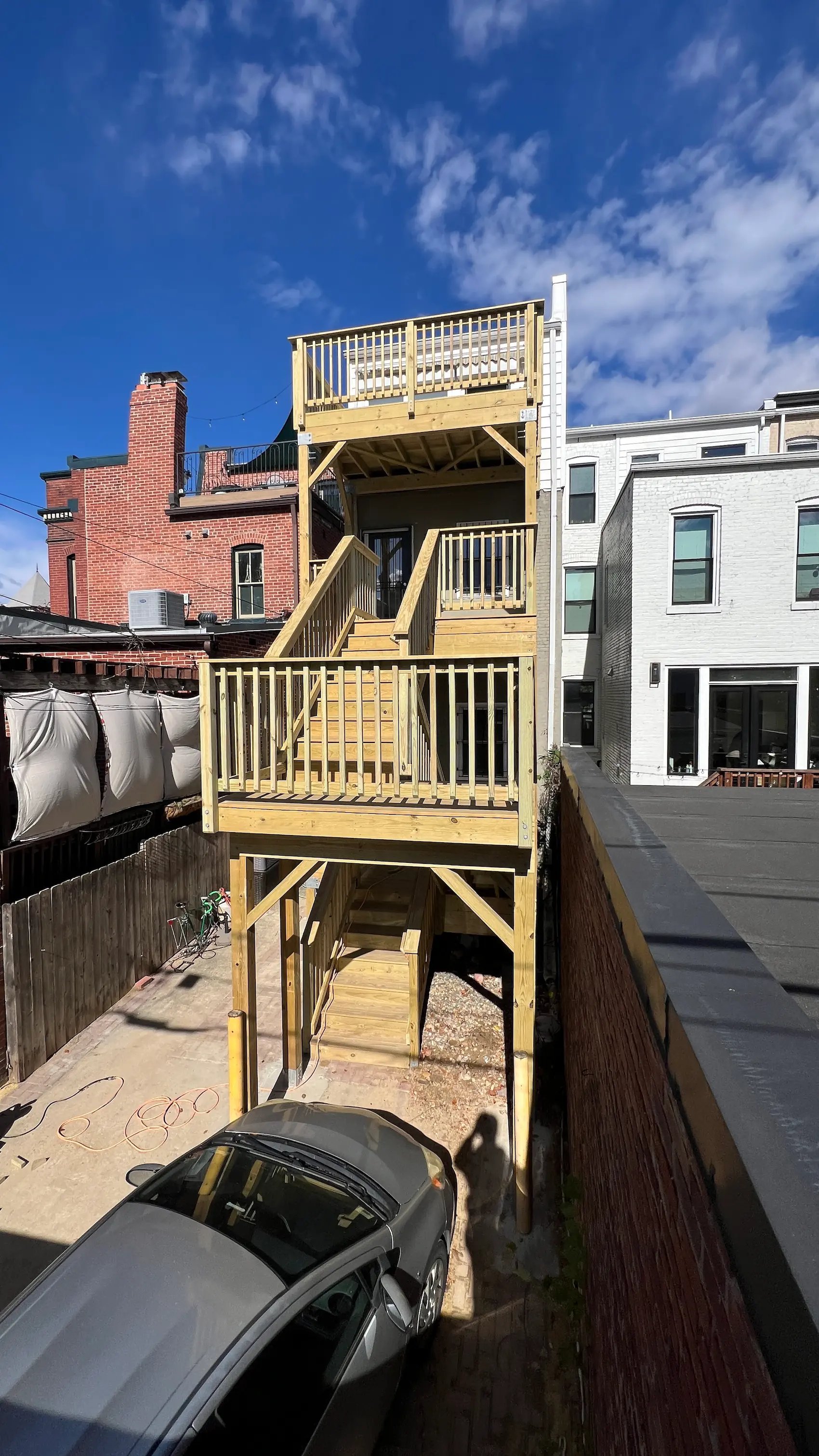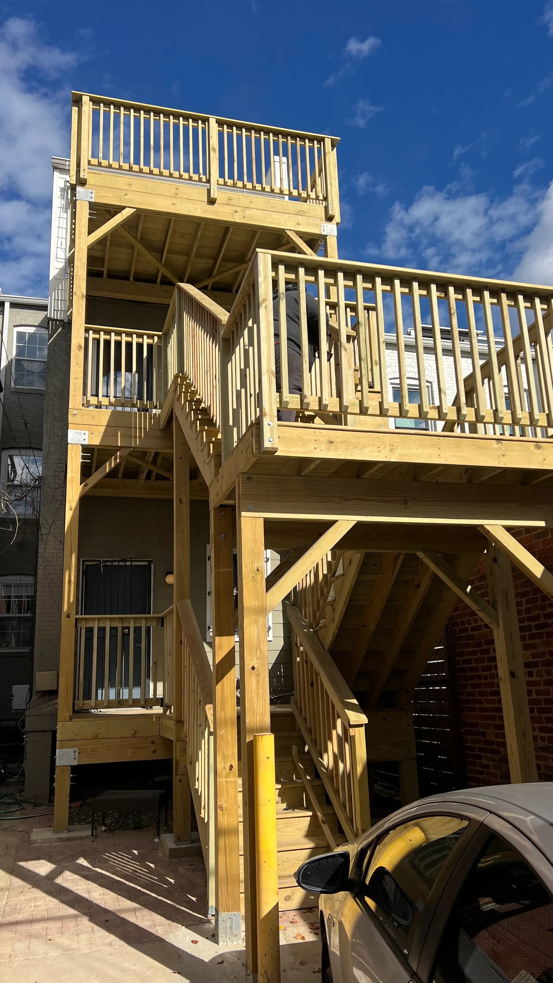 This three-story deck build in NW Washington, DC was designed and installed in collaboration with a structural engineer to meet the city’s strict permitting and safety requirements. Space was tight, so we incorporated a cantilevered staircase—allowing the homeowner to keep valuable parking underneath while maintaining full functionality and flow.
